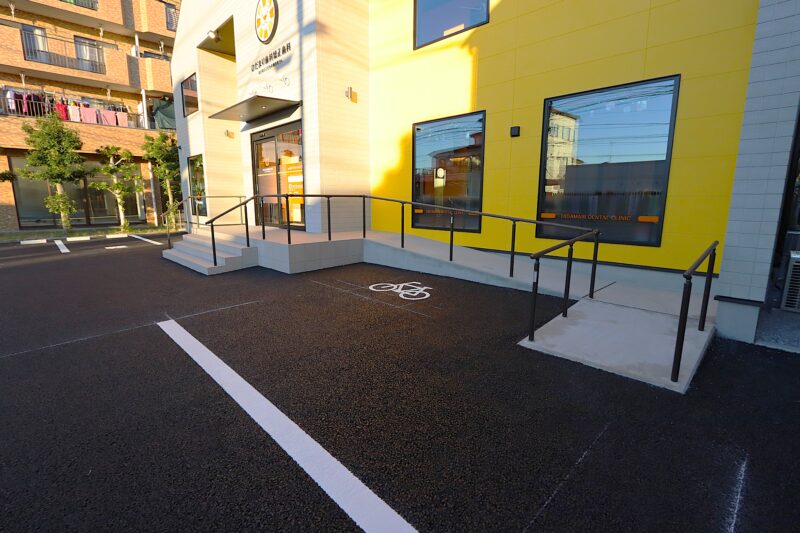 入口スロープ(バリアフリー)と駐輪場