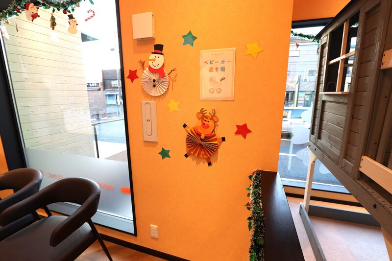 待合スペース奥に「ベビーカー置き場」のスペースを作っています